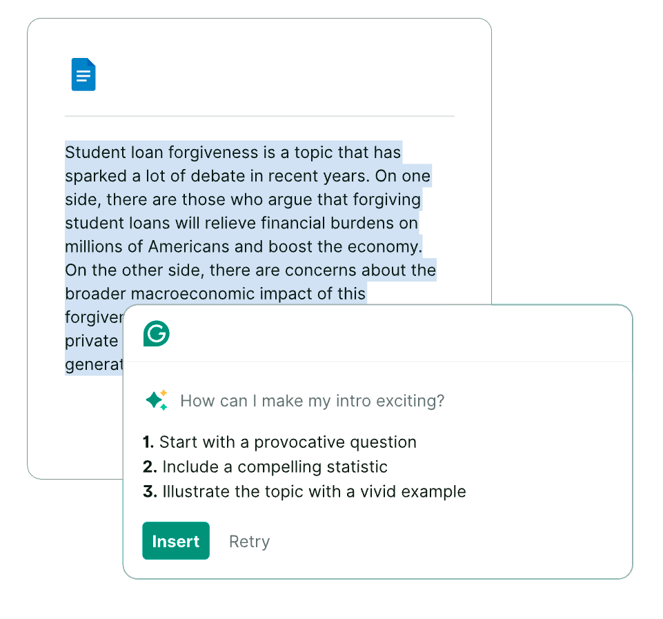 Seja para escrever um email de arrecadação de fundos como administrador, enviar uma comunicação para toda a equipa enquanto reitor ou elaborar uma tarefa de escrita como estudante de primeiro ano, o Grammarly adapta-se a tudo o que precisa. O nosso modelo de IA personalizado entende o público e os seus objetivos, utilizando-os para fornecer sugestões estratégicas que o ajudam a comunicar com clareza.
